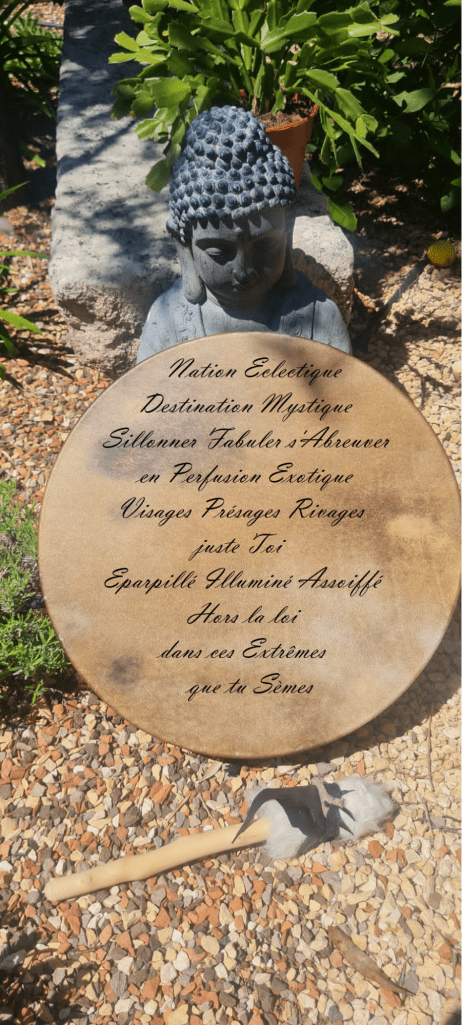 Au fil de cette expérience itinérante, les mots-rivages et mots-images s’entrelacent aux sons et aux pulsations du tambour, éveillant en nous une mémoire profonde, celle de nos racines, de la Terre, du sacré. Lâcher prise, laisser les mots se libérer, se laisser porter par le rythme… et se laisser traverser par l’énergie d’une échappée vagabonde.
